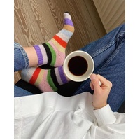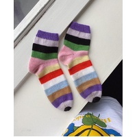 The multicolored Everyday Socks are knitted in Arwetta by Filcolana in the colors Thistle flower [268], Lavender frost [267], Navy blue [145], Juicy green [279], Pale rose [186], French vanilla [196], Chock orange [252], Snow white [100], Ice blue [340] and Caramel [363].