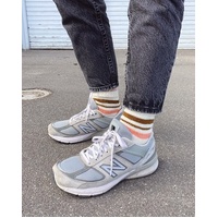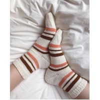 The white Everyday Socks with stripes are knitted in Sisu by Sandnes Garn in the colors of Hvit [1002], Støvet korall [4015] and Gyllenbrun [2564].