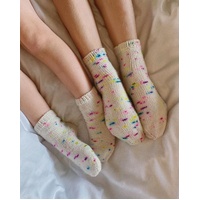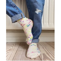 The white Everyday Socks Junior are knitted in the Sysleriget Sock by Sysleriget in the color Unicorn Party.