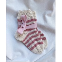 The white and pink Everyday Socks Junior are knitted in Sunday by Sandnes Garn in the colors Whipped cream [1012] and Støvet rose [4332].