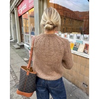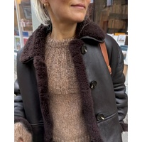 The brown Sunday Sweater is knitted in Snefnug by CaMaRose in the color Nøddebrun [7104] held together with Silk Mohair by Isager in color 7S.